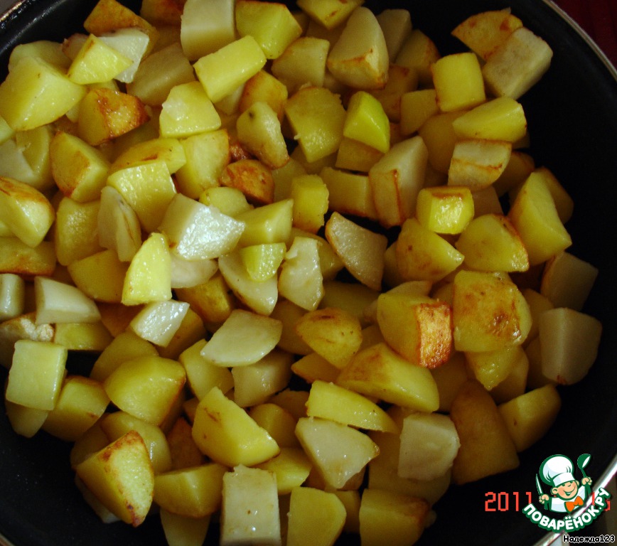 Обжариваем картофель на сильном огне, пока не зарумянится.