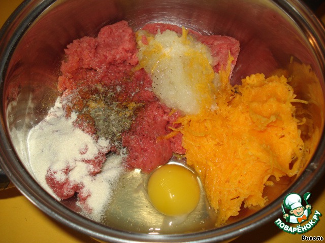 Мясо с одной луковицей измельчить в фарш, добавить 150 г натертой на средней терке тыквы (сок выдавить руками), кукурузную муку (или манку), яйцо, соль, специи.