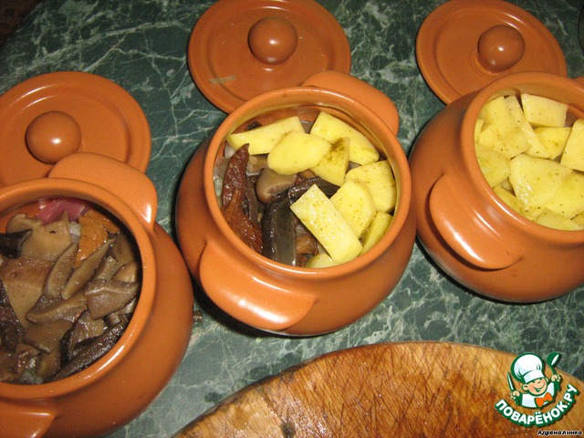 Когда выложили картошку, необходимо залить горшочки грибным бульоном, чуть-чуть накрывая её.