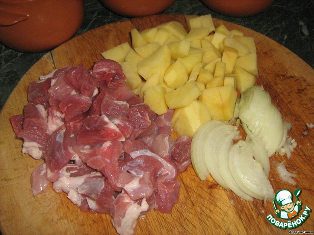 Мясо режем кубиками, картошку - ломтиками, лук - полукольцами.