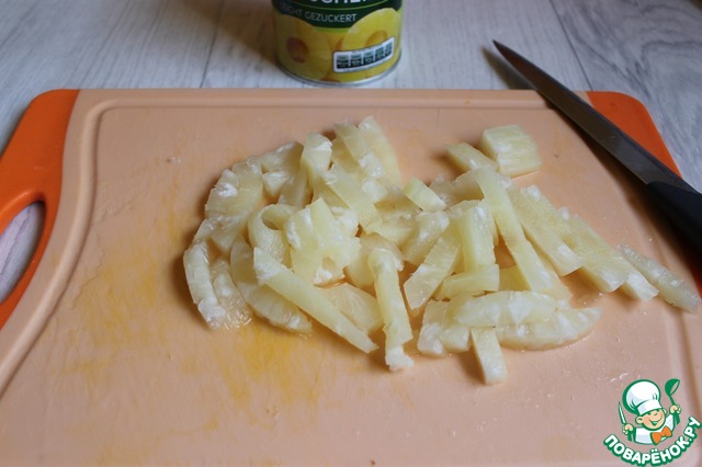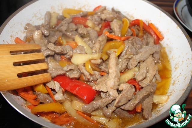 Разогреем хорошо масло на сковороде и обжарим овощи 3-4 минуты, добавим ананас. Овощи убeрем и в этом же масле обжариваем мясо, постоянно помешивая. Примерно 10 минут. В конце добавляем овощи, все перемeшиваем и выключаем огонь.