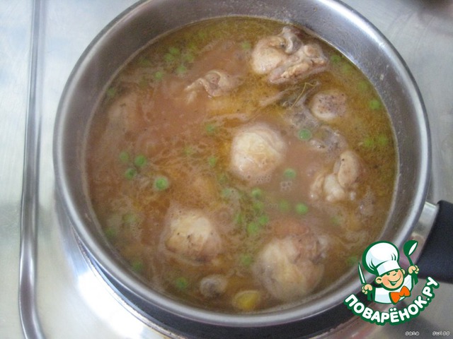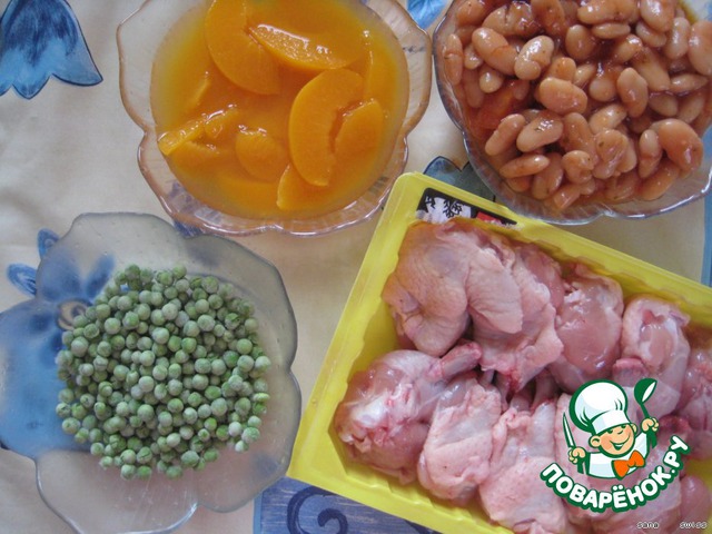Добавить фасоль, горошек, манго (или персик) и после закипания протушить еще минут 5-10.
