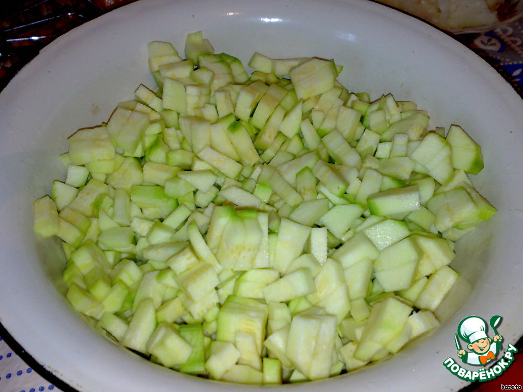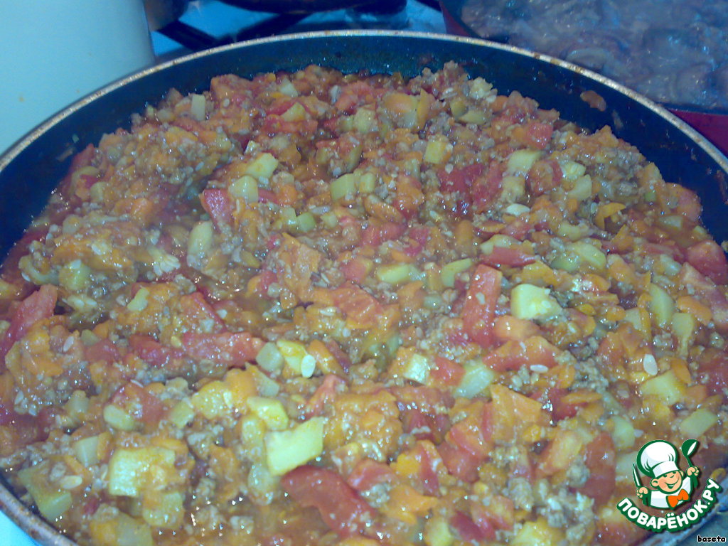 | Не судите строго, это мой дебют! Подобных рецептов много и, может быть, я повторяюсь... но очень захотелось попробовать себя в роли поваренка... Рагу из помидорчиков, кабачков, морковки, лука и фарша. |