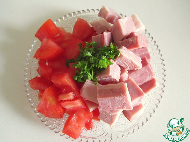В конце добавить рубленную зелень, ветчину (150 гр) и помидор (1 шт), нарезанные кубиками. Посолить и поперчить по вкусу.