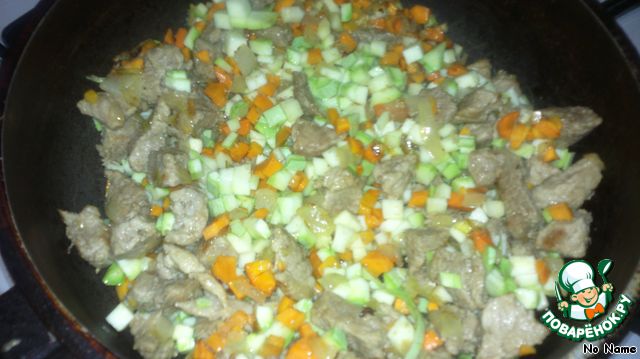 Нарежем мелкими кусочками мясо и обжарим его до готовности, не накрывая крышкой.Н о важно при этом - не пересушить мясо.