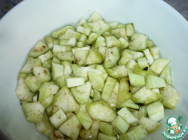 Очистить и нарезать кубиками баклажаны. Залить подсоленной водой и оставить на минут 20.