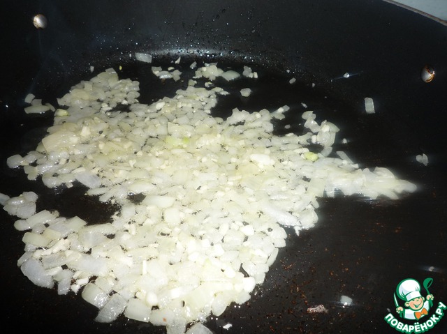Налить в глубокую сковородку масло, пассeруем лук, чеснок.
