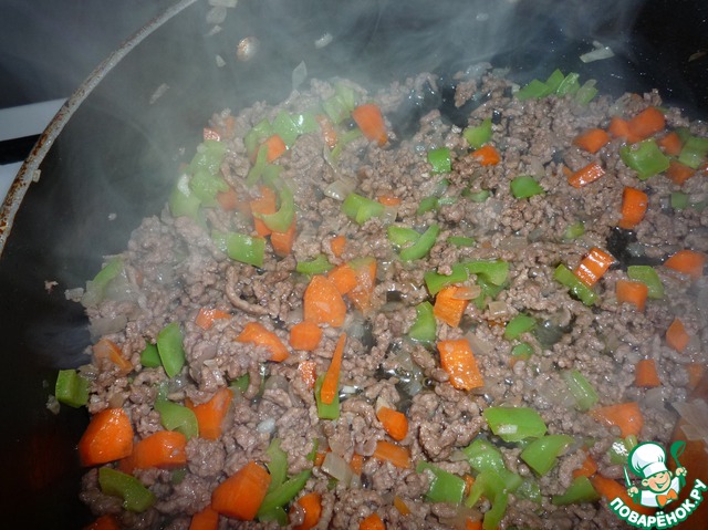 Добавляем, морковь, перец, мешаем. Тушим еще минуты 2-3.