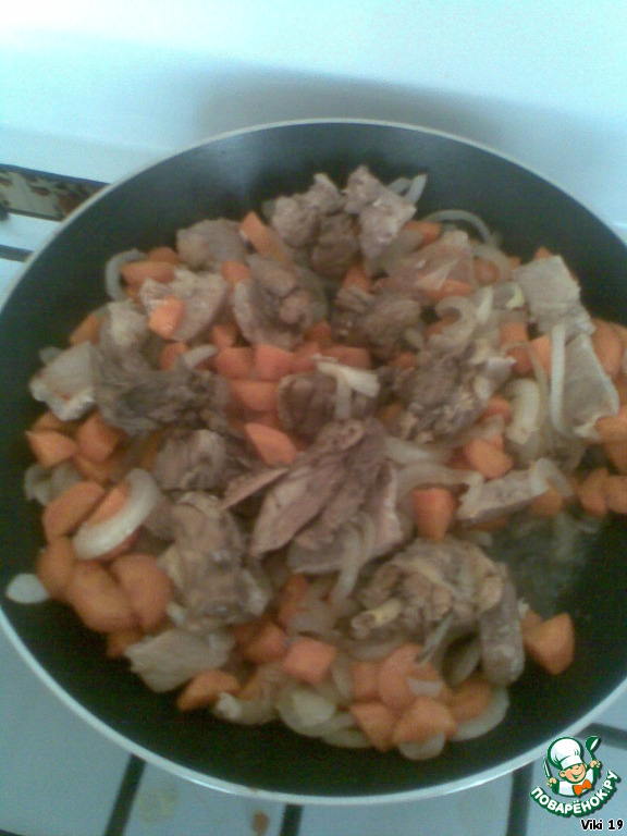 Мясо, морковь режем кубиками, лук полукольцами. Все вместе прожариваем 10-15 мин. Высыпаем в кастрюлю.