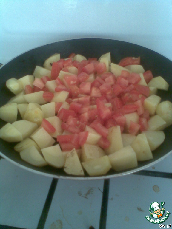 Картошку режем кубиками, прожариваем до золотистой корочки, потом добавляем помидоры, нарезанные кубиками, тушим 5 мин. Высыпаем в кастрюлю.