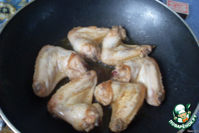 Обжариваем крылышки на сковороде, вынимаем и отставляем в сторону.