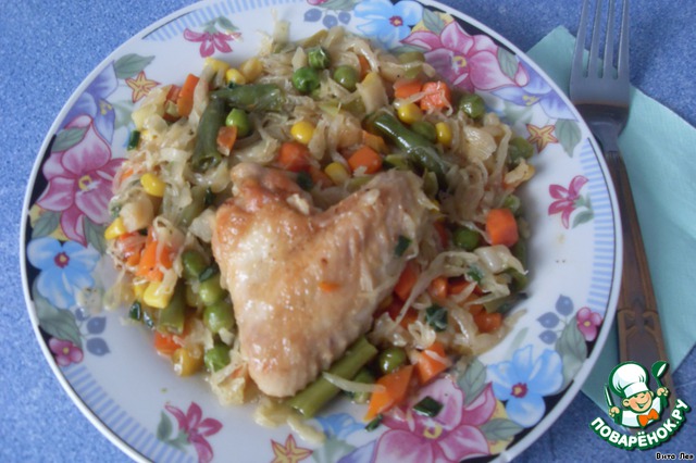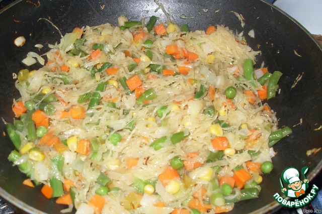 После добавляем овощную смесь (не размораживая предварительно), солим, перчим и тушим.