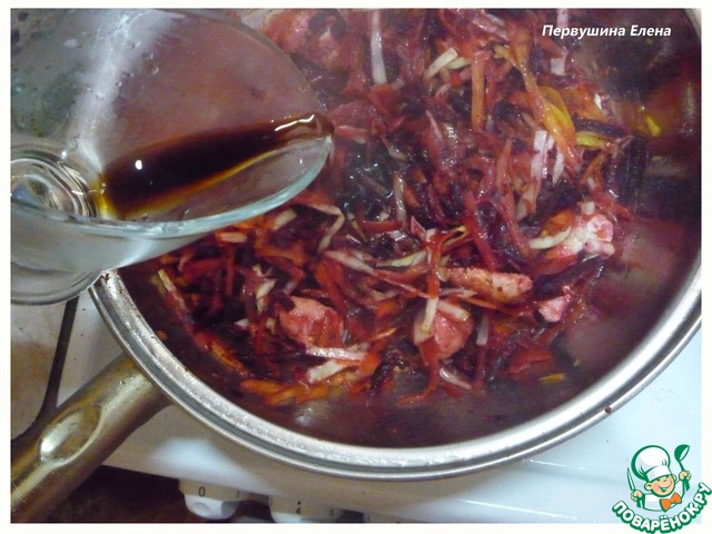 Налить в сковороду масло и обжарить лук с морковью, добавить мясо, залить водой и тушить 20 минут под закрытой крышкой на маленьком огне. Положить капусту, тыкву, свеклу и, не закрывая крышку, тушить минут 10. Вода немного выпарится.