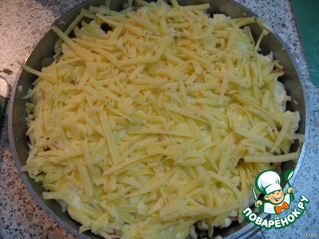 Залить сметанным соусом, посыпать сыром и отправить в прогретую духовку на 15 минут при температуре 175 градусов.
