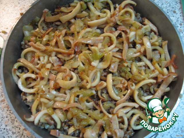 | Никогда бы не подумала, что можно совместить кальмара и гречку... Ан нет! Результат перед вами! Нам понравилось. Быстро, сытно, вкусно!!! И нежно!!! |