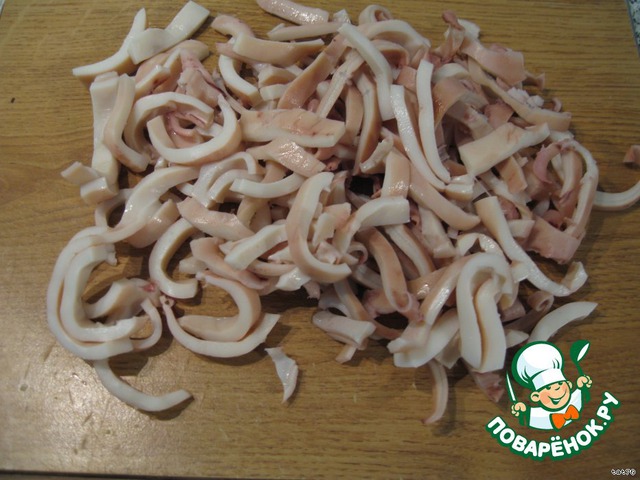 Кальмары отварить в течение 3-5 минут в подсоленной воде. Нарезать ломтиками.