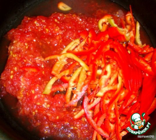 Помидоры натереть на терке до шкурки, шкурку выбросить. Перцы почистить, нарезать тонкими длинными полосками. Положить все в сковороду, добавить сахар, вылить в сковороду вино и тушить до мягкости перцев.