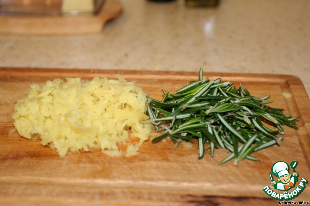 Натираем на терку бОльшую половину корня имбиря, разрываем листочки 3-х веточек розмарина.