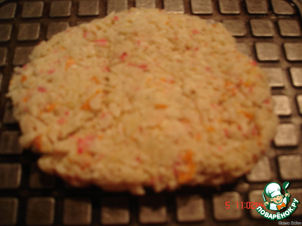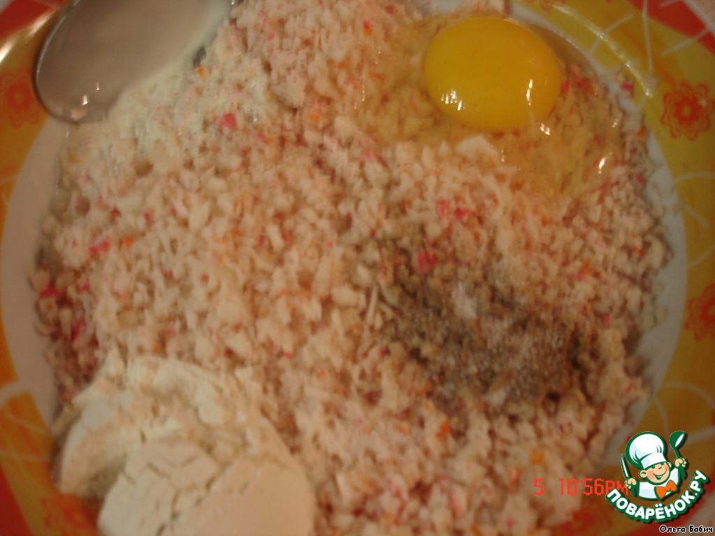 Крабовые палочки перемолоть с луком на блендере, добавить соль, перец, яйцо, муку, сливки, хорошо перемешать. Полученная масса не должна быть жидкой.