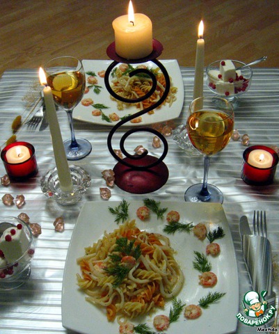 | это блюдо просто идеально для романтического ужина... оно так просто готовится, но получается очень нежным.. сочным.. ярким лакомством.. морепродукты, чили.. - признанные афродизиаки, но обращать на это внимание любимого не стоит, ведь не известно, может он решит, что Вы сомневаетесь в его мужской силе.. пусть это останется нашей маленькой ЖЕНСКОЙ ТАЙНОЙ.. Ваша вторая половина, непременно, останется довольна.. и подарит Вам не только замечательный вечер.. на конкурс "Подари мне этот вечер" |
