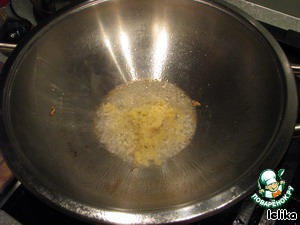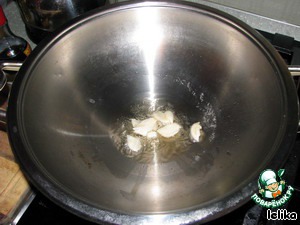В вок наливаем растительное масло и соевый соус. Хорошенько разогреваем, опускаем дольки чеснока. Ждем, когда пойдет приятный чесночный аромат, и достаем чесночок.