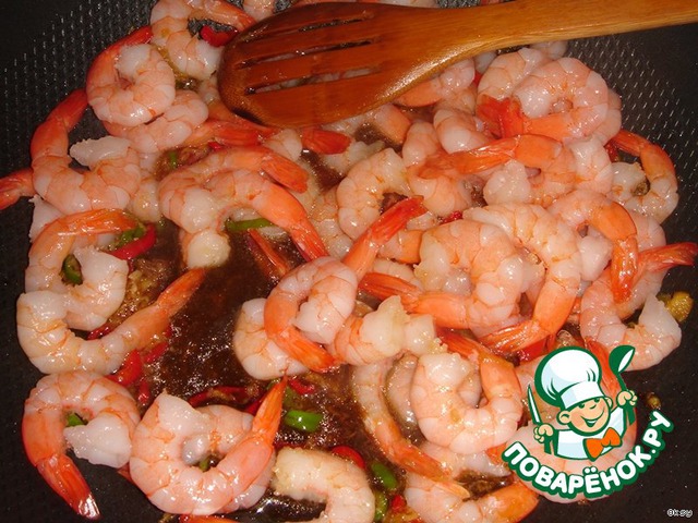 Добавить очищенные креветки, хвостики оставить неочищенными, потом удобнее кушать. Вместе обжаривать еще 2 -3 минуты.