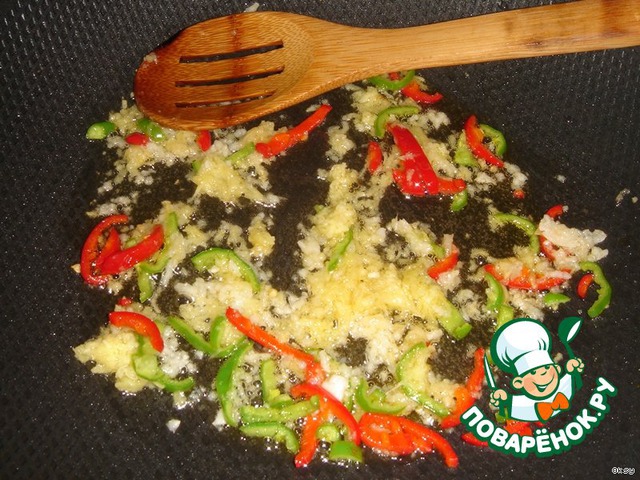Чеснок и имбирь измельчить, перец нарезать соломкой, обжарить на растительном масле в вок 1-2 минуты.