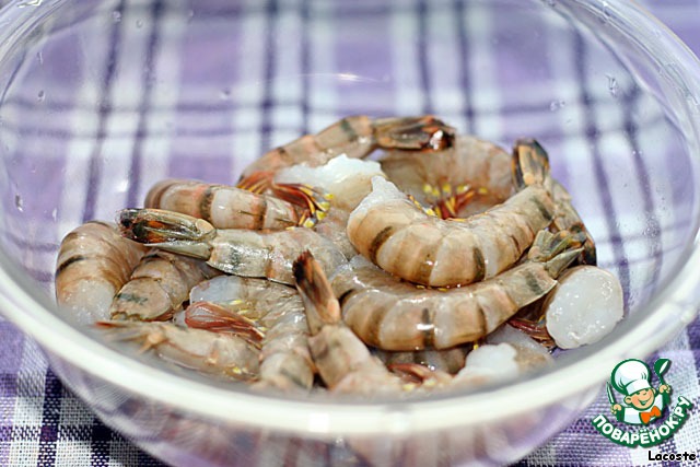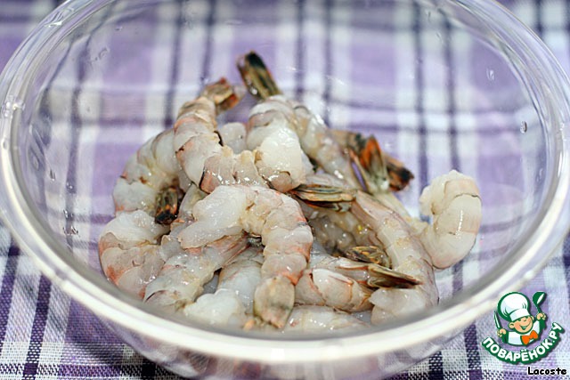 Креветки разморозить (если заморожены) в холодильнике положив их в дуршлаг и подставив под него емкость, для того чтобы стекала вода.