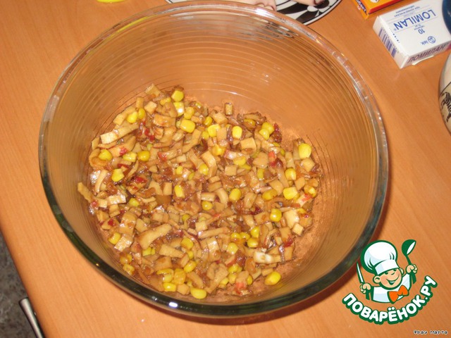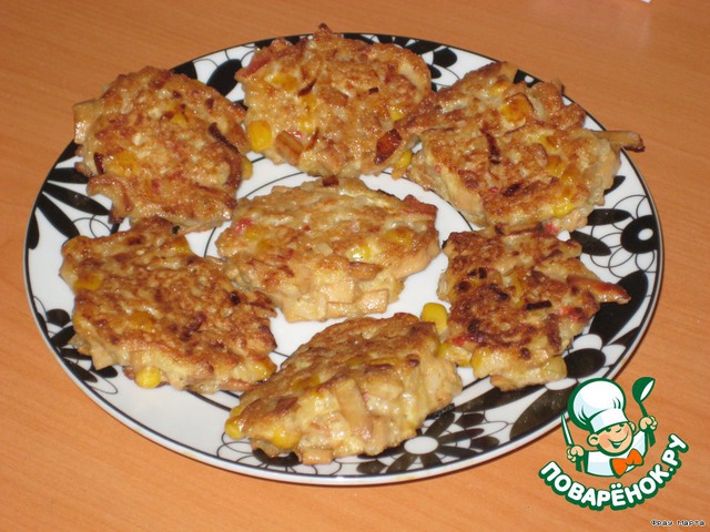 Крабовые палочки порезать кубиками и добавить к луку, обжарить. Добавить консервированную кукурузу, обжарить еще 5 минут и выключить. Переложить в миску.