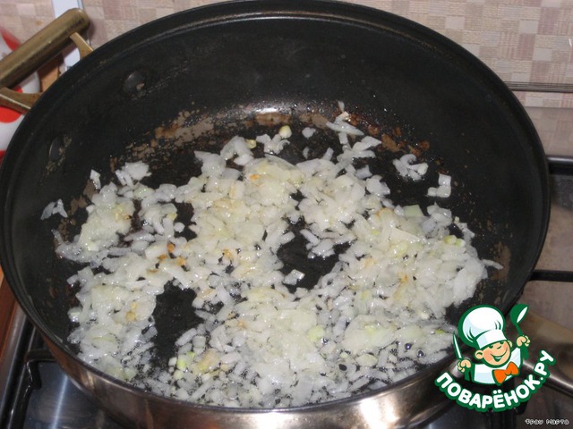 Лук мелко нарезать и обжарить на растительном масле до золотистого цвета.