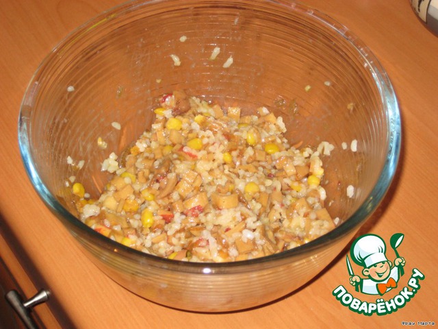 Рис отварить и добавить к нашей зажарке. Все посолить, заправить яйцами, перемешать. Начинка готова!