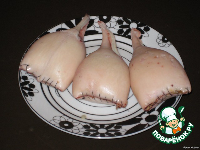 Теперь берем кальмара и фаршируем начинкой. Края зашить ниткой. Отварить в воде 5-7 минут.