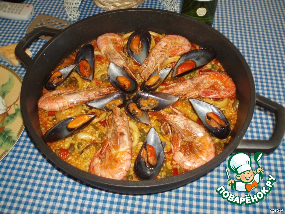 | Паэлья -это одно из национальных испанских блюд. Есть разные виды паэльи и готовят еe все по-разному, здесь я видела некоторые рецепты, но они не похожи на настоящую испанскую паэлью, поэтому хочу предложить вам свой рецепт паэльи с морепродуктами. Я давно живу в Испании и готовлю многие испанские блюда, а вот паэлью никогда не решалась приготовить, мне она казалась сложным блюдом, но вот недавно нашла на одном испанском сайте один из вариантов еe приготовления и он мне понравился, и на днях я еe приготовила, получилась она у меня, даже лучше, чем во многих ресторанах, очень вкусная, красивая и ароматная!!! Вот предлагаю вам этот рецепт. P. S. К сожалению, когда я еe готовила, я ещe не была здесь зарегистрирована, и не могу предложить вам пошаговых фотографий, но окончательный результат, я всe-таки запечатлела... |