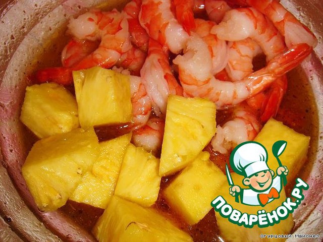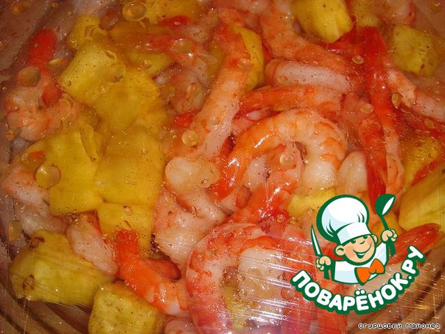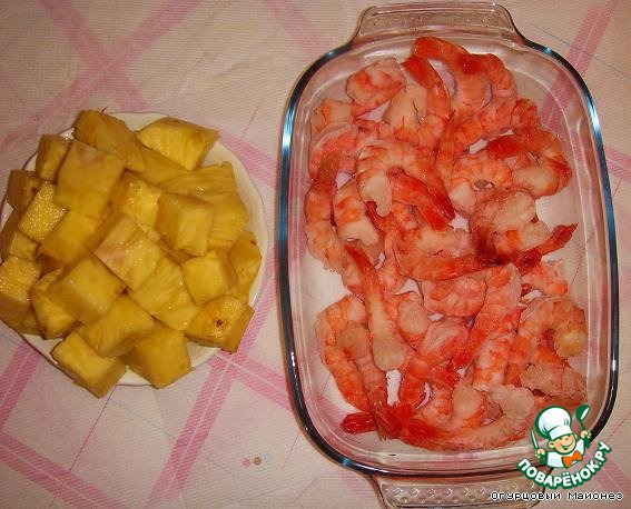 Нарезаем ананас крупными кубиками, креветки размораживаем (если купили замороженные).