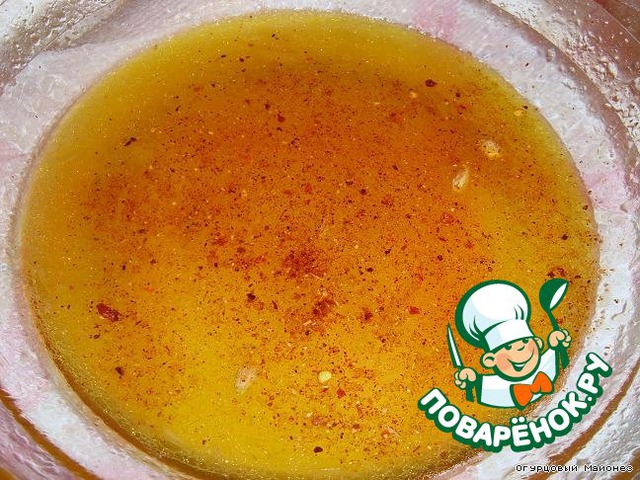 мёд, уксус, оливковое масло, специи. Туда же выжимаем сок лимона.