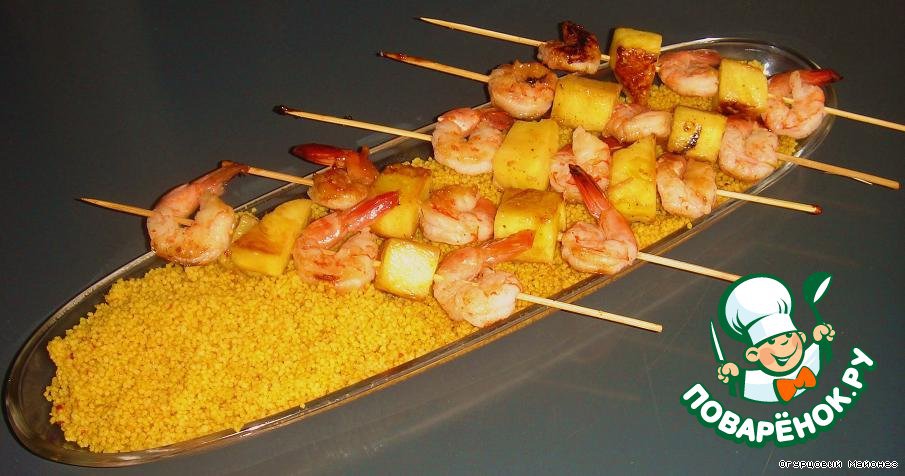 Через полчаса достаем креветки с ананасом из холодильника и нанизываем их на шпажки. Разогреваем сковороду с растительным маслом, и выкладываем на неё шашлычки. Обжариваем с обеих сторон, немного добавляя к каждой порции оставшейся маринад.