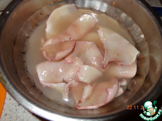 Затем складываем в глубокую посудину и заливаем кипятком из чайника буквально на 1-2 минуты. На фото видно, что те пленочки, которые не снялись с сырого кальмарчика, отошли, и теперь их без труда можно убрать.