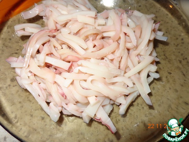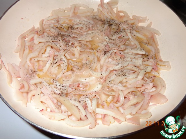 Разогреваем на сковороде (или сотейнике) сливочное масло, кладем туда соломку из кальмаров и тушим буквально 3-4 минутки. Солим, перчим.