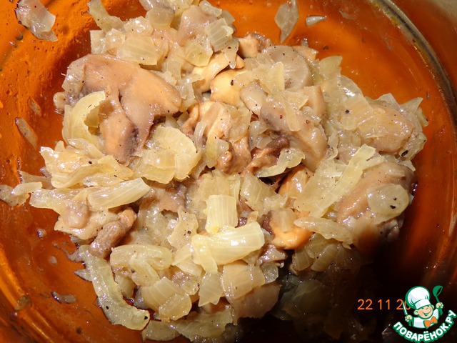 Луковицу мелко нарезаем, пассеруем, добавляем грибы, солим, перчим. У меня уже были обжаренные грибы с луком (остатки от вчерашней фаршированной рыбки).