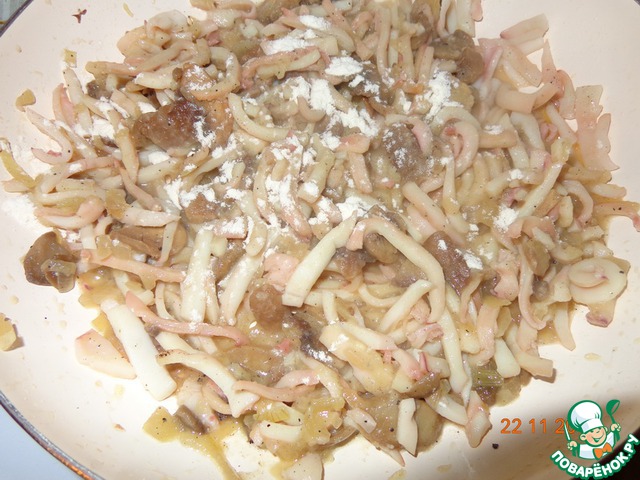 Затем добавляем грибы с луком, еще буквально 3-4 минутки тушим, добавляем муку. Я добавила столовую ложку, можно больше, если любите соус погуще. Хорошо перемешиваем.