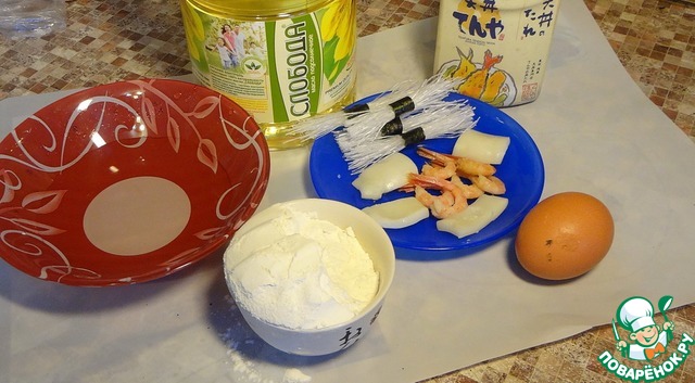 | Само слово темпура обозначает способ приготовления продуктов в кляре, жаренных во фритюре. В Японии этим способом готовят рыбу, морепродукты, овощи, фрукты и очень редко - мясо. Сегодня мы приготовим темпуру облегчённым способом из креветок, кусочков кальмара и рисовой лапши. |