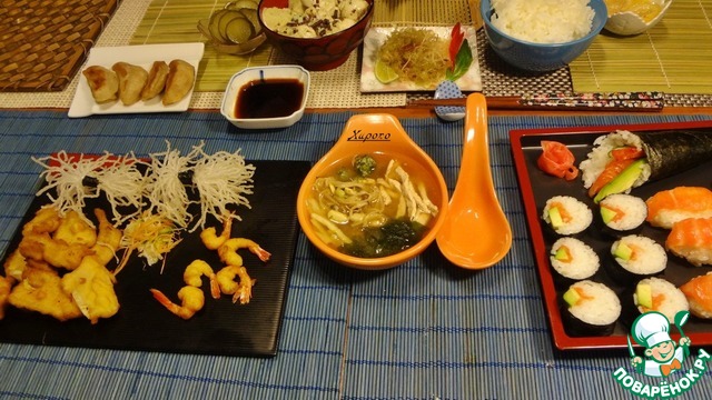 Японский стол отличается от русского. в частности. тем. что подают на стол очень много разных закусок и закусочек по-чуть-чуть в разные тарелочки. Кстати, посуда в Японии ценится тем. чем разнообразнее тарелки ставят при сервировке. У европейцев стараются, чтобы посуда была выдержана в одном стиле, а лучше всего если она из одного сервиза. А в Японии чем разнообразнее, тем лучше. Потому что японцы "едят глазами". Они всё любят созерцать: природу, красивую посуду, красиво поданную еду и т. д.