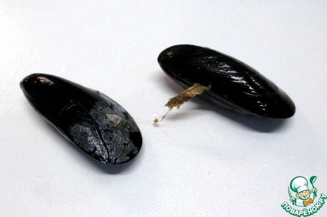 Мидии хорошо промыть и почистить, если они в этом нуждаются. Для этого отрезать отросток, похожий на водоросль, и соскребсти наросты на раковине. Мидии с треснувшими раковинами выкинуть.
