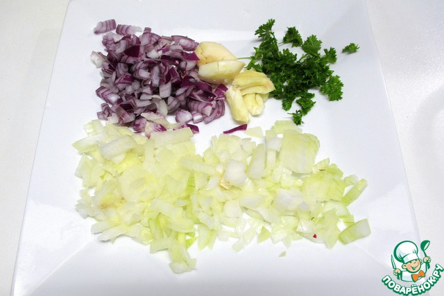 Лук (1 большой репчатый, 2 маленьких красных) и петрушку мелко нарезать, чеснок (3 зубчика) раздавить при помощи боковой стороны ножа.