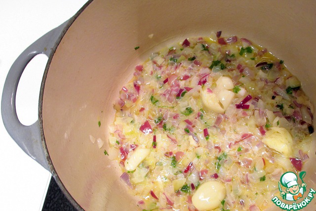 В холодную кастрюлю положить сливочное масло (70 гр), растопить его на небольшом огне, добавить лук, чеснок и петрушку. Пассеровать до слегка золотистого лука. Он должен быть готовым, но не зажаренным.