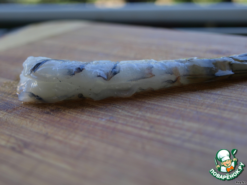 Затем на внутренней стороне хвоста сделаем три неглубоких поперечных надреза, чтоб креветки при жарке не сворачивались клубком, а оставались ровными
