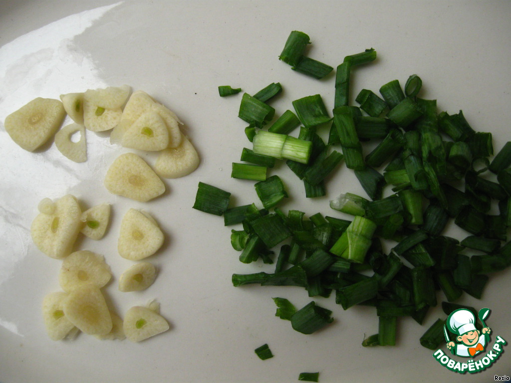 Не очень мелко нарезать чеснок и лук.
