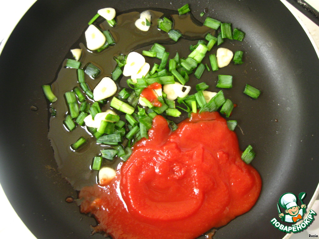3. В сковородку налить 3 ст.л. оливкового масла + 3 ст.л. томатной пасты + чеснок + лук. Жарить несколько минут, чтоб чеснок и лук дали свой вкус и аромат. Снять с огня.