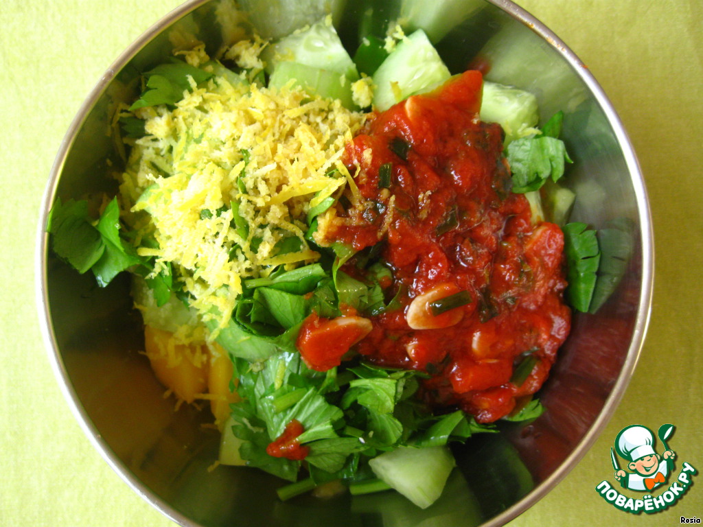 5. Смешать все ингредиенты для сальсы: манго + огурец + зелень + чили (или 4 ст.л. сладкого чили-соуса) + цедра 1 лимона + смесь с чесноком и луком (пункт № 3) + 2 ст.л. бальзамического уксуса.