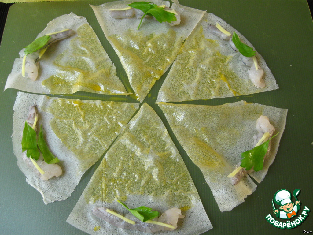 10. Лист фило разрезать на 6 частей (если у вас квадратные листы, то на квадратики шириной чуть больше креветки). Выложить креветки, сверху на них 2-3 ломтика имбиря и листик сельдерея. Тесто намазать желтком (чтоб было легче намазывать можно добавить 1-2 ч.л. воды).